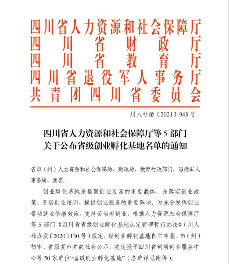 本网讯(文、图/魏玮)近日,我校大学生创新创业孵化基地再次被四川省人力资源和社会保障厅等5部门评定为省级创业孵化基地。本次评审从今年2月开始启动,历时一年,全省共109所申报单位经过材料审核、实地考察、现场答辩、专家评选等方式综合评审,最终50所申报单位(6所高校)被评定为省级创业孵化基地。