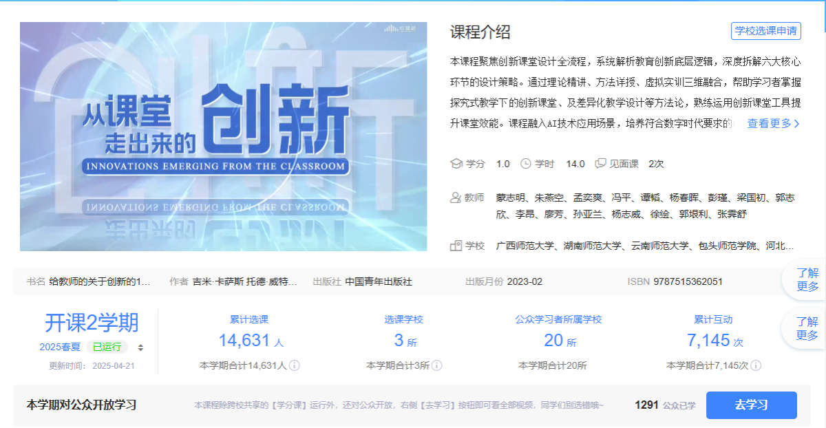 该课程聚焦创新课堂设计全流程,系统解析教育创新底层逻辑,深度拆解聚焦创新课堂设计全流程。课程融入AI技术应用场景,培养符合数字时代要求的创新型教师,助力师范生实现从教学新手到创新引领者的进阶。