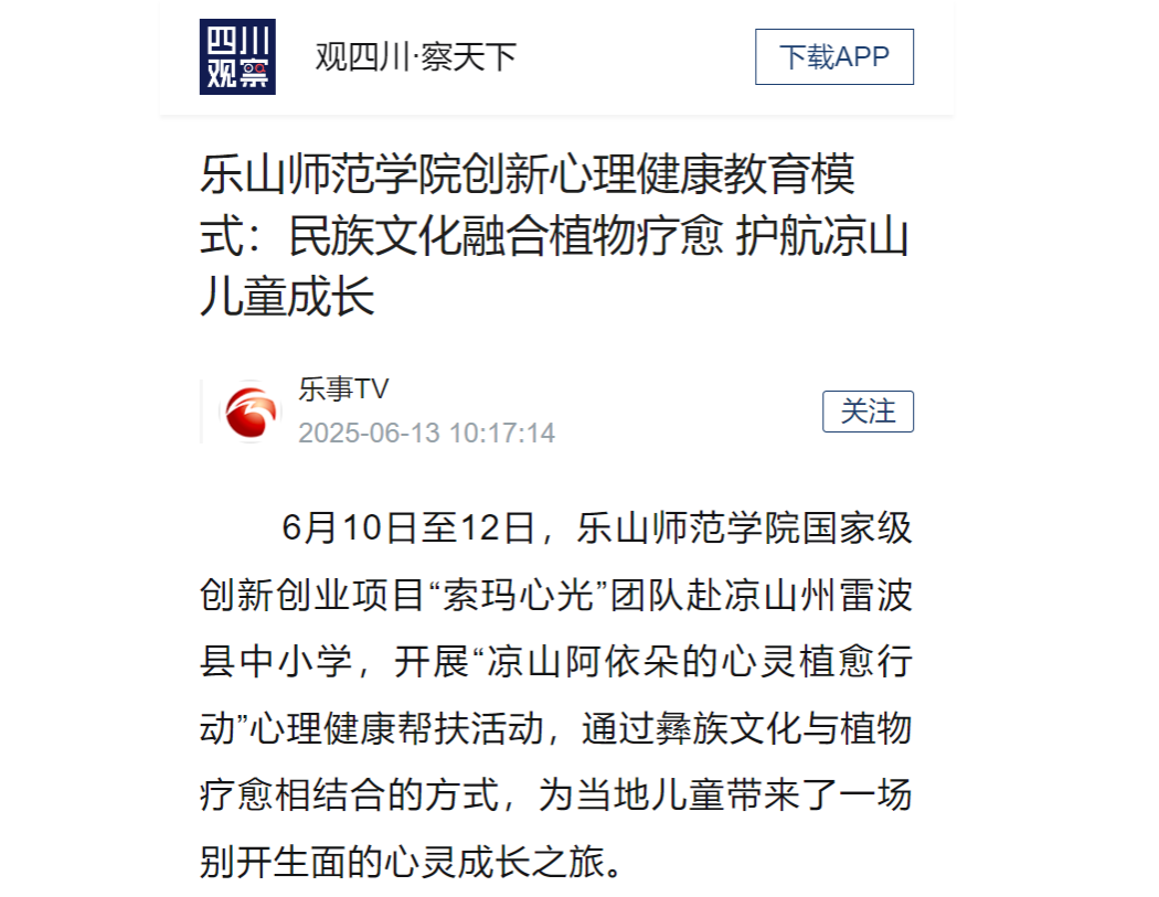 本网讯(文、图/张伊颖)近日,必威西汉姆联国家级创新创业项目“索玛心光”团队创新形成“彝族文化+植物疗愈”心理帮扶模式,其在凉山州雷波县中小学开展的心理健康实践引发媒体关注。四川教育发布、四川观察等媒体聚焦报道该团队将彝族文化符号与现代心理疗愈技术深度融合的特色路径。