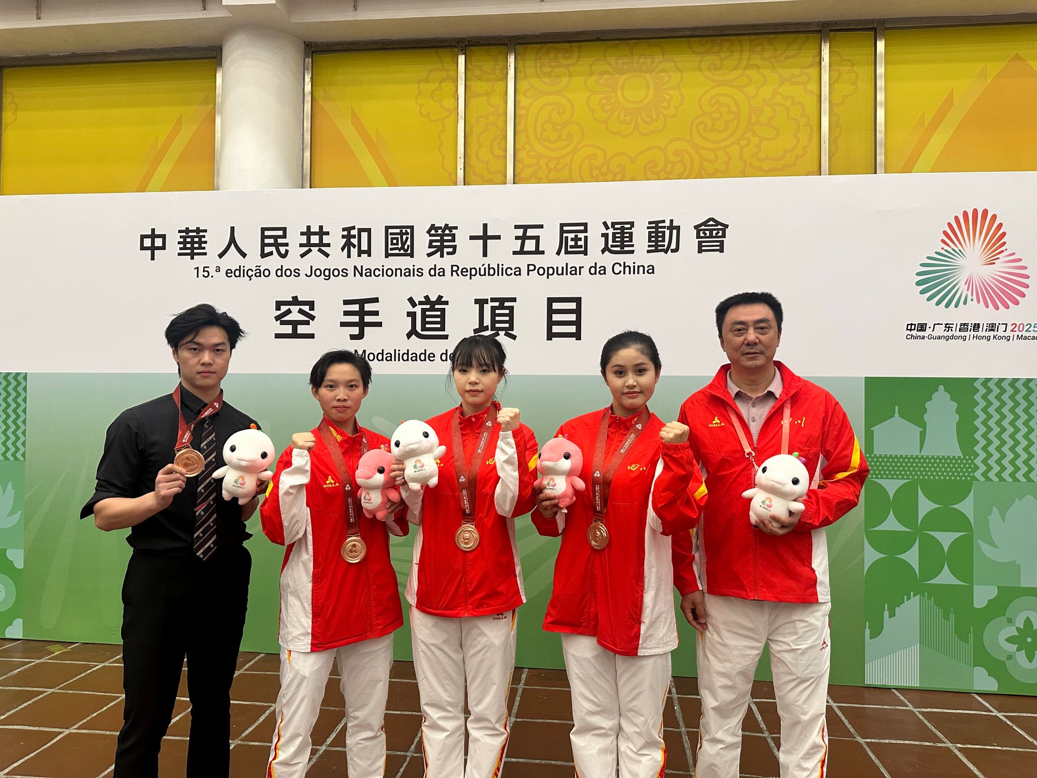 本网讯(文、图/贺金涛)近日,在第十五届全运会群众组空手道项目的赛场上,四川代表队奋勇争先,其中来自我校体育学院的陈佳慧、陈琪、牟福馨三位队员,在女子团体型项目中凭借精湛技艺与默契配合斩获铜牌,为四川省实现了该项目的历史性突破。作为本次四川省代表队的专业训练服务单位,四川华明雅和体育文化传播有限公司的专业保障与全程护航为运动员逐梦赛场筑牢坚实后盾。