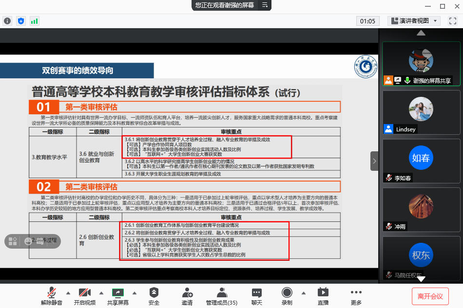 谢强老师就高校如何提升赛事质量,推动赛教融合,完善赛事组织管理,提高赛事成绩这些问题与痛点,进行系统的讲解与指导。通过本次工作坊,我校师生对大赛的政策有了更加深入的了解,明确了项目需进一步修改和完善的方向,为下一阶段备战第八届中国国际“互联网+”大学生创新创业大赛打下了坚实的基础。