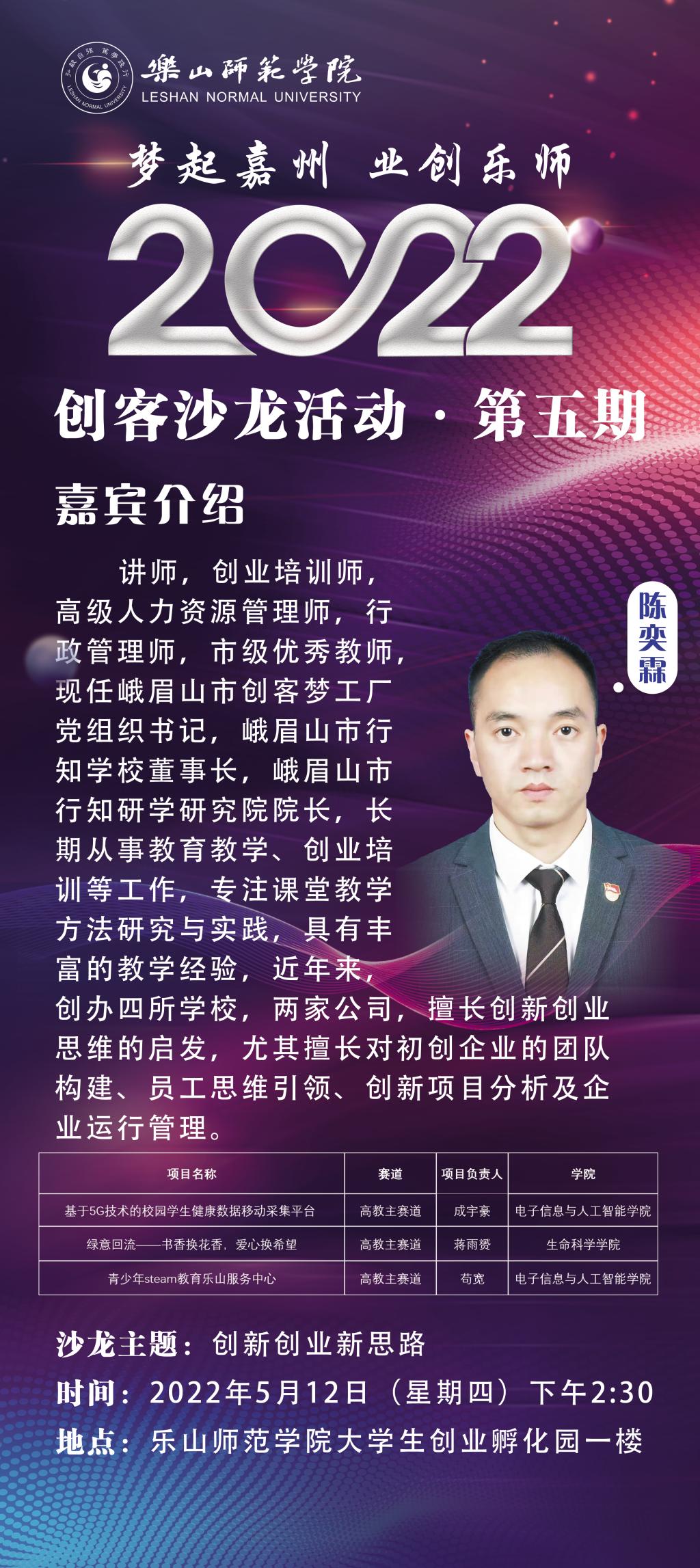 嘉 宾:峨眉山市创客梦工厂党组织书记陈奕霖 主 题:创新创业新思路 时 间:5月12日(本星期四)下午2点30 地 点:孵化园1楼