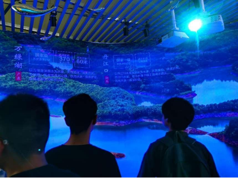 到达峨眉山市农夫山泉生产基地后,同学们在讲解员的带领下参观长廊——“秘境寻踪”探访农夫山泉水源地。讲解员介绍了用“春夏秋冬”分别代表四个水源地的体验馆。