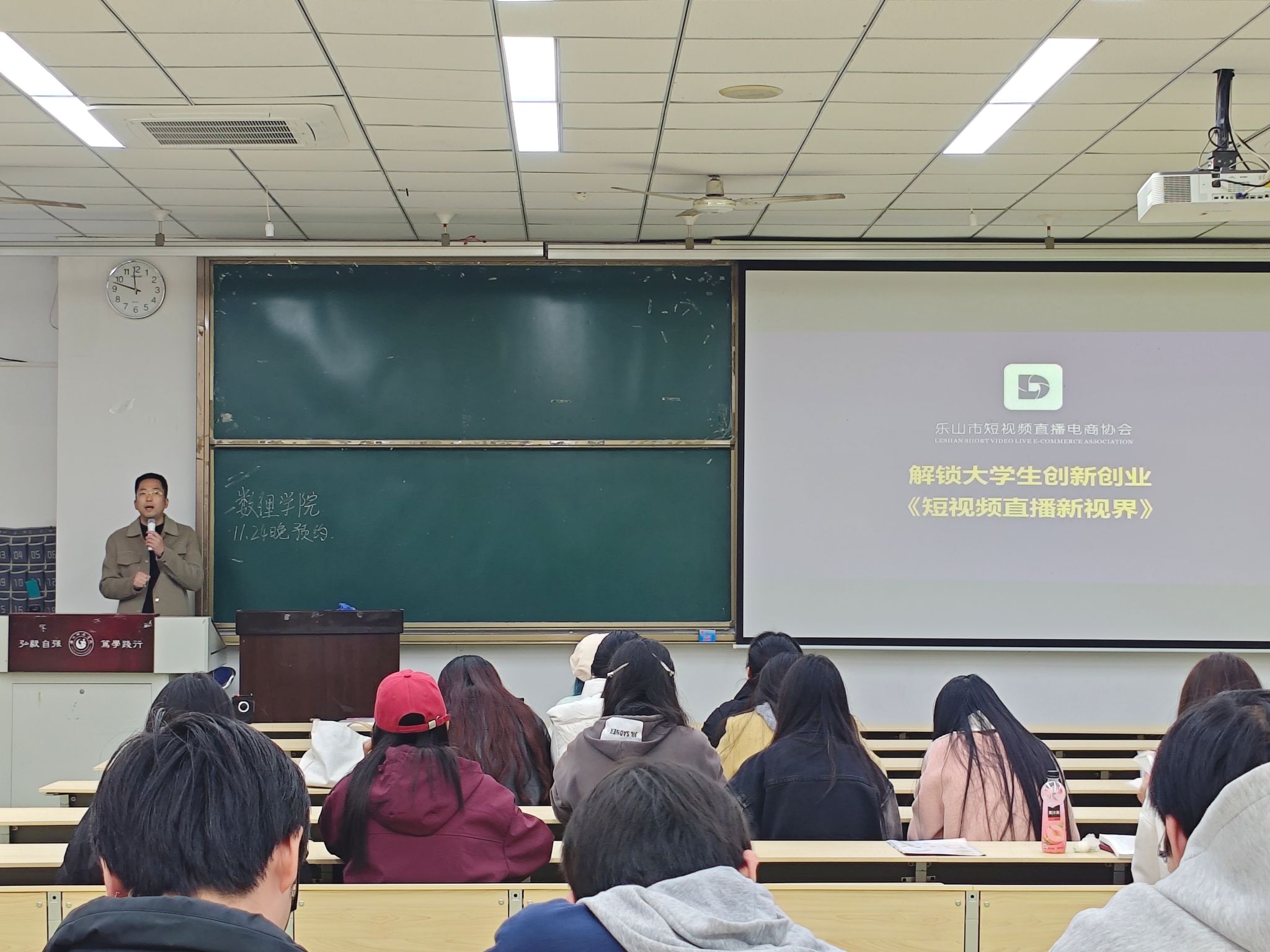 本网讯(文/图 邓西) 11月24日,创新创业学院在行知楼125举办题为“短视频直播新视界”的创业主题讲座。乐山短视频直播电商协会会长胡健康老师与外语学院200余名学生就“短视频的发展、就业创业机会、大学生如何参与其中”等方面进行了分享。